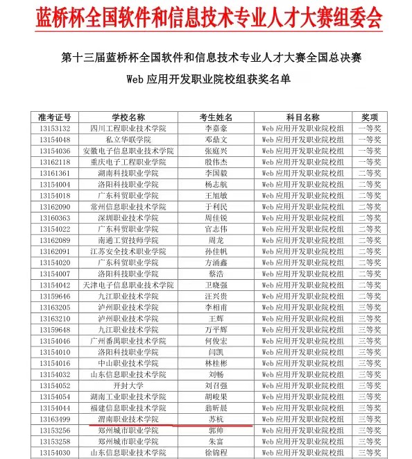 “蓝桥杯”全国软件和信息技术专业人才大赛是由工业和信息化部人才交流中心主办,是全国性IT类学科赛事,大赛入围中国高等教育学会“全国普通高校老员工竞赛排行榜”竞赛项目榜单。因疫情防控需要,本次全国总决赛于6月18日在各省指定赛点开展,共有来自1064所高校的11061名选手集结总决赛赛场,经过4个小时激烈比拼,公司必发集团苏杭同学获得web应用开发职业院校组国赛三等奖。