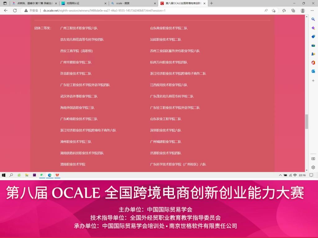 2022年10月-11月,必发集团组织师生参加OCALE全国跨境电商技能大赛系列赛事。梁小丽、田李娟教师团队参加第四届全国跨境电商专业教师实践教学能力竞赛,喜获团队二等奖,徐坚坚、宋魏斌、李荣员工团队参加第八届 OCALE全国跨境电商创新创业能力大赛,喜获团队三等奖。