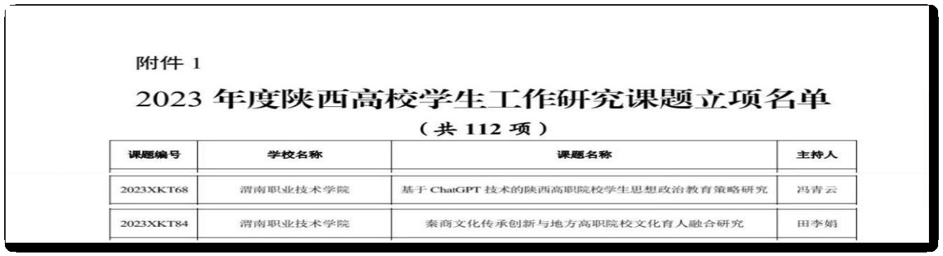 立项省级以上课题9项,其中省社科联课题4项,教育厅课题2项,省职教学会课题2项,省教育科学“十四五”规划课题1项。在研省级以上课题3项。立项校级课题11项。