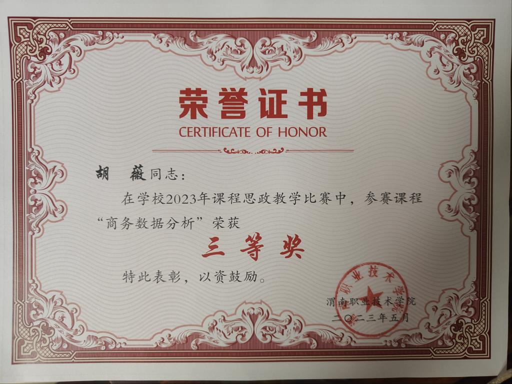 在校级教师教学能力大赛中获优秀组织奖,二等奖1项,三等奖4项。在课程思政教学大赛中获一等奖1项、三等奖2项,在课堂革命典型案例大赛中荣获一等奖1项、二等奖2项。