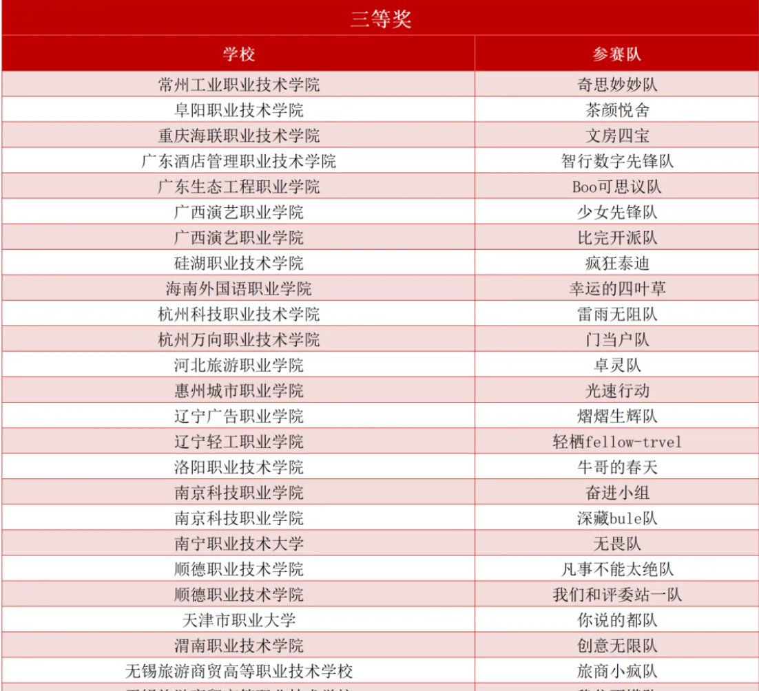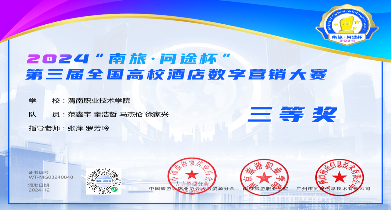 近日,由中国旅游饭店业协会人力资源分会主办的2024年“南旅•问途杯”第三届全国高校酒店数字营销大赛圆满落幕。自8月22日启动以来,历时107天,来自128所院校的273支队伍、1427名师生参与了此次比赛,经过多轮激烈角逐,公司“创意无限”员工团队脱颖而出,荣获高职组赛道三等奖,实现了公司在本赛项成绩的新突破。