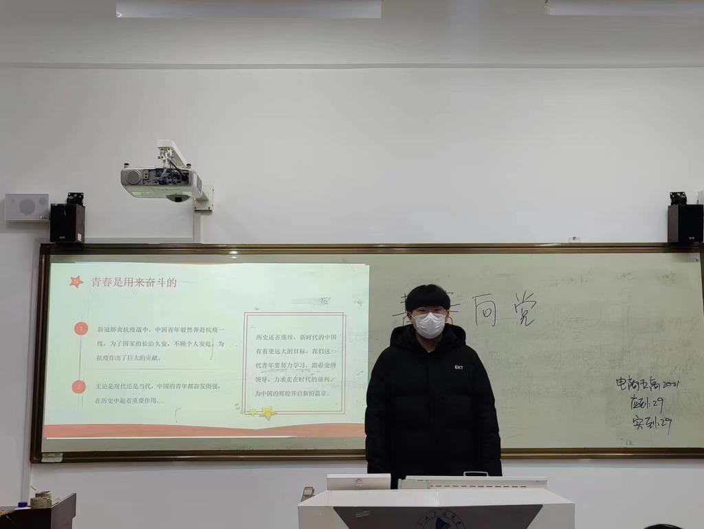 全体参会人员首先起立奏唱团歌,随后团支书向大家讲解中国共产党百余年来为人民民主不懈奋斗的辉煌历程,让同学们深刻认识到青春是用来奋斗的,并告诫同学们作为新时代的新青年,一定要积极向上、朝气蓬勃,要担当作为,坚定自身理念信念,志存高远,脚踏实地,将自己的人生理想融入伟大的中国梦之中。